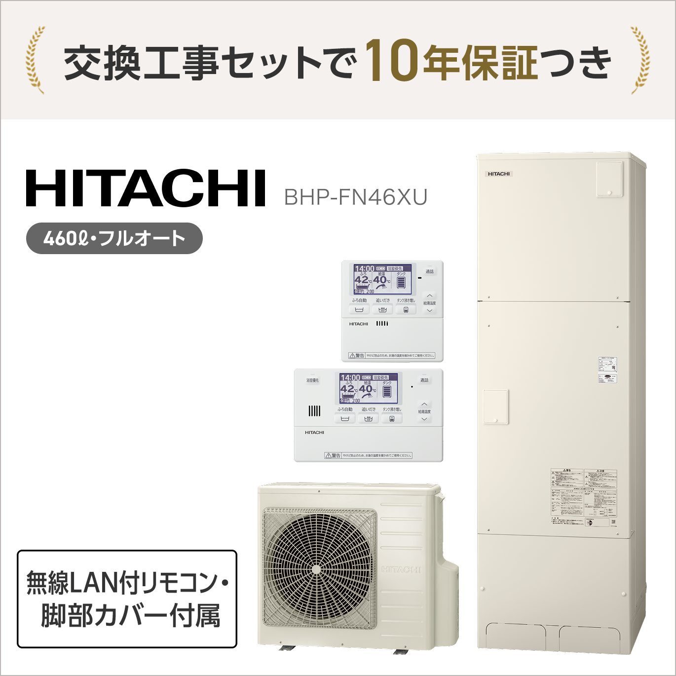 無料10年保証付 日立 BHP-FN46XU エコキュート フルオート370L 4~6人用リモコン・脚部カバー付属 BER-X1FH-T BEAK-46X<処分費込>【エコキュート+交換工事セットがオトク】