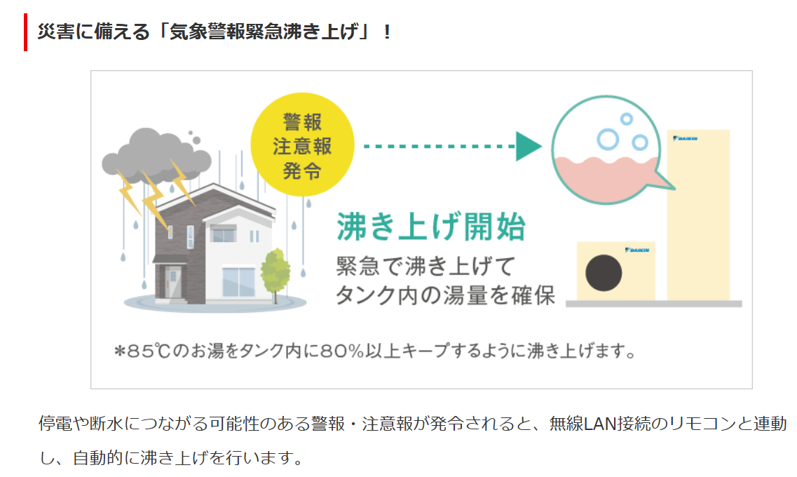 停電や断水につながる可能性のある警報・注意報が発令されると、無線LAN接続のリモコンと連動し、自動的に沸き上げを行います。