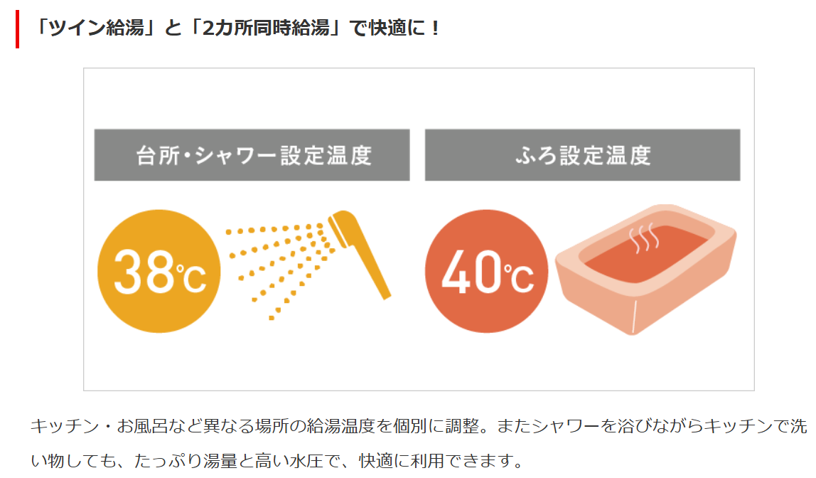 「ツイン給湯」と「2カ所同時給湯」で快適に!