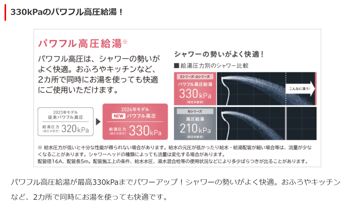 パワフル高圧給湯が最高330kPaまでパワーアップ!シャワーの勢いがよく快適。おふろやキッチンなど、2カ所で同時にお湯を使っても快適です。