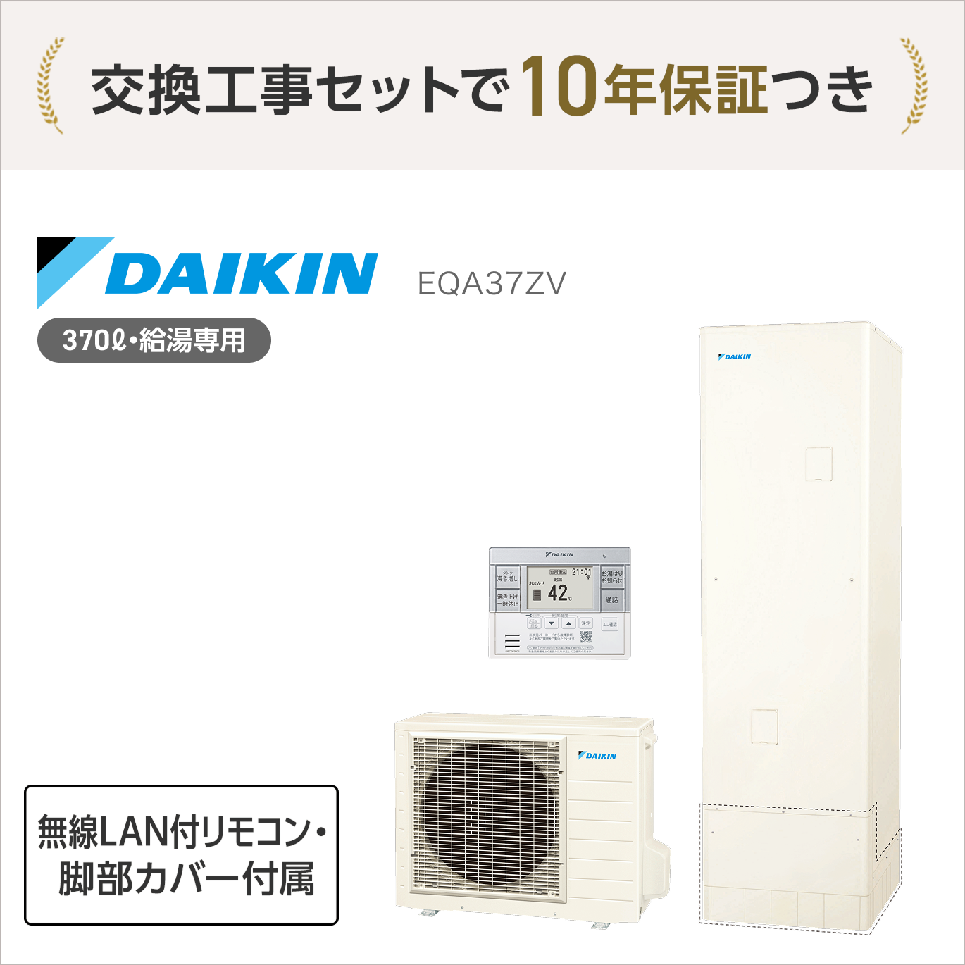 無料10年保証付 ダイキン EQA37ZV エコキュート 給湯専用 370L 3~5人用 無線LANリモコン・脚部カバー付属 BRC083H31 KKC022E4 <処分費込>【エコキュート+交換工事セットがオトク】