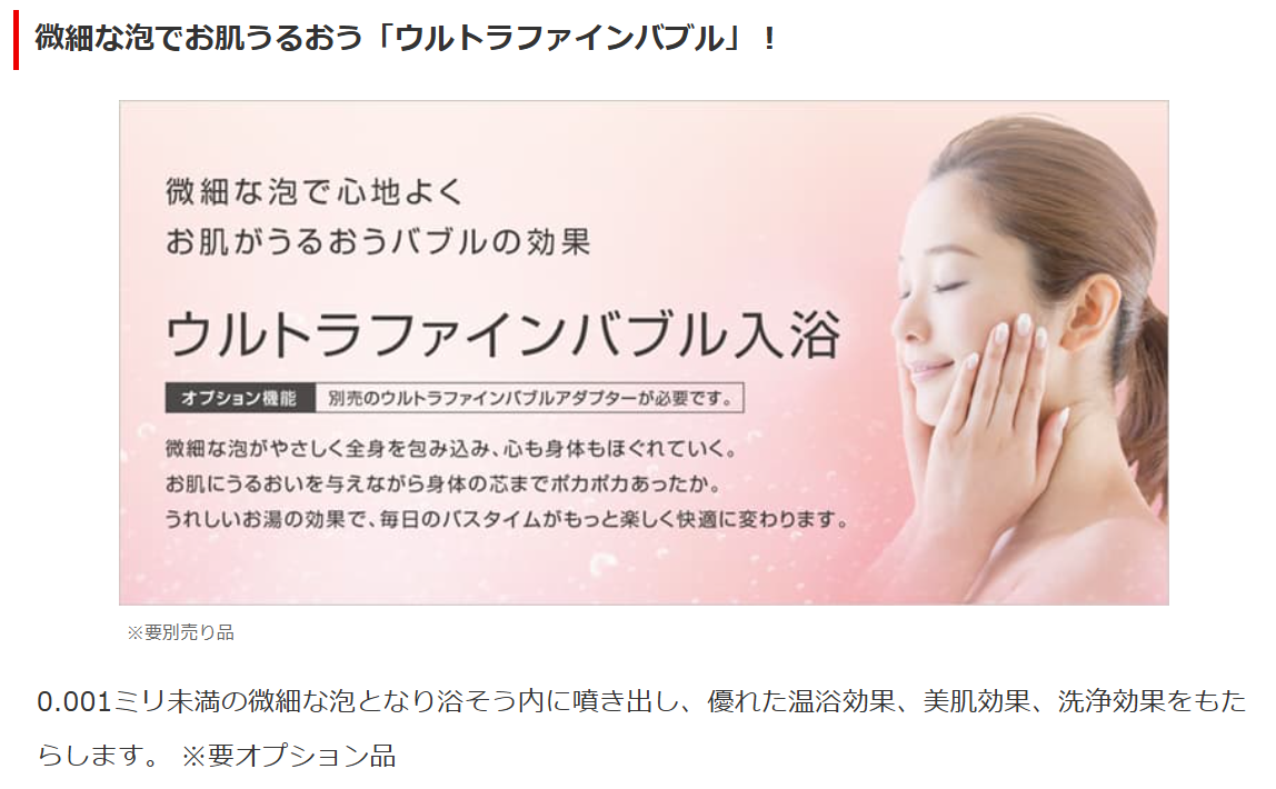 0.001ミリ未満の微細な泡となり浴そう内に噴き出し、優れた温浴効果、美肌効果、洗浄効果をもたらします。 ※要オプション品