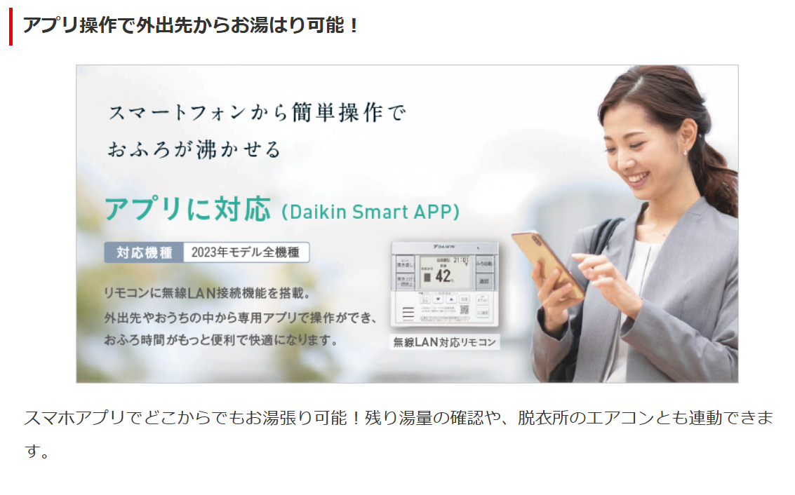 | 機能・特徴 | ウルトラファインバブル ※要 別売アダプター 天気予報連動 気象警報緊急沸き上げ 無線LAN対応リモコン Daikin Smart APP 対応 ECHONET Lite 規格&AIF認証対応 昼間シフト機能 電力抑制設定 温浴タイム ツイン給湯 ふろ自動 自動保温/自動たし湯 高温たし湯 エコふろ保温 自動ふろ配管洗浄 |