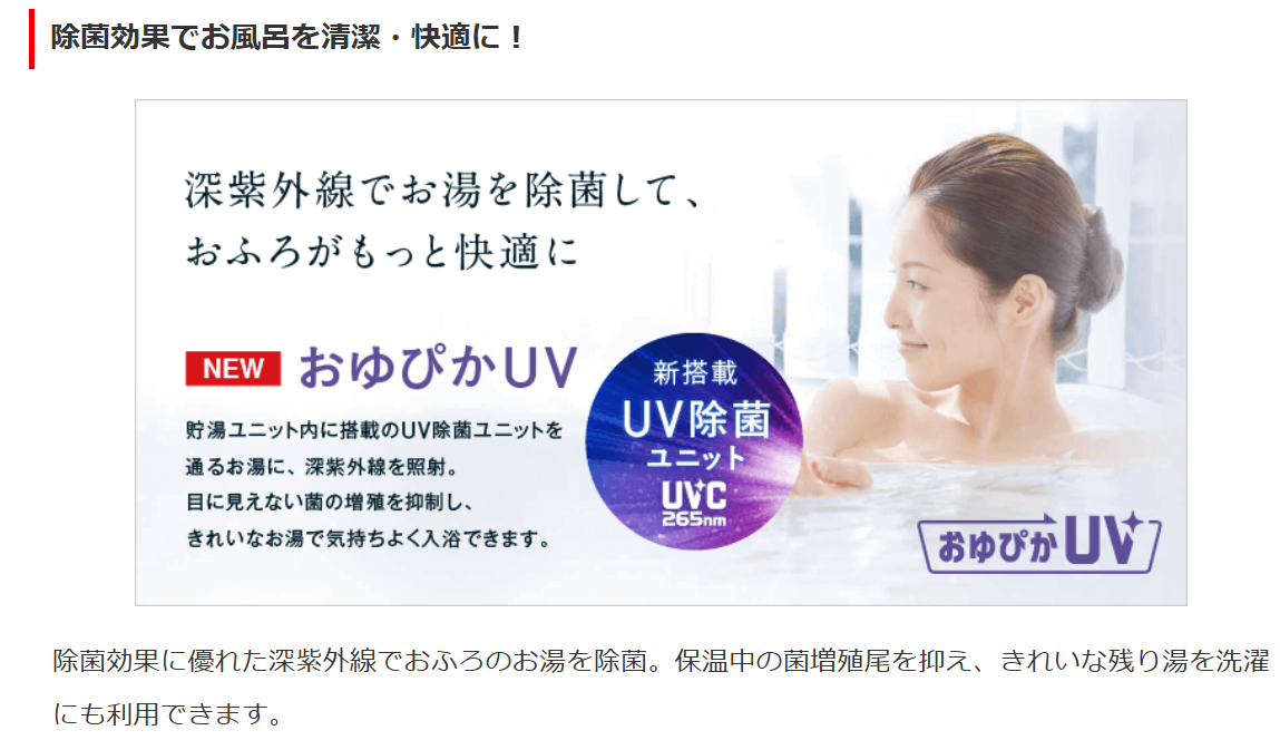 除菌効果に優れた深紫外線でおふろのお湯を除菌。保温中の菌増殖尾を抑え、きれいな残り湯を洗濯にも利用できます。