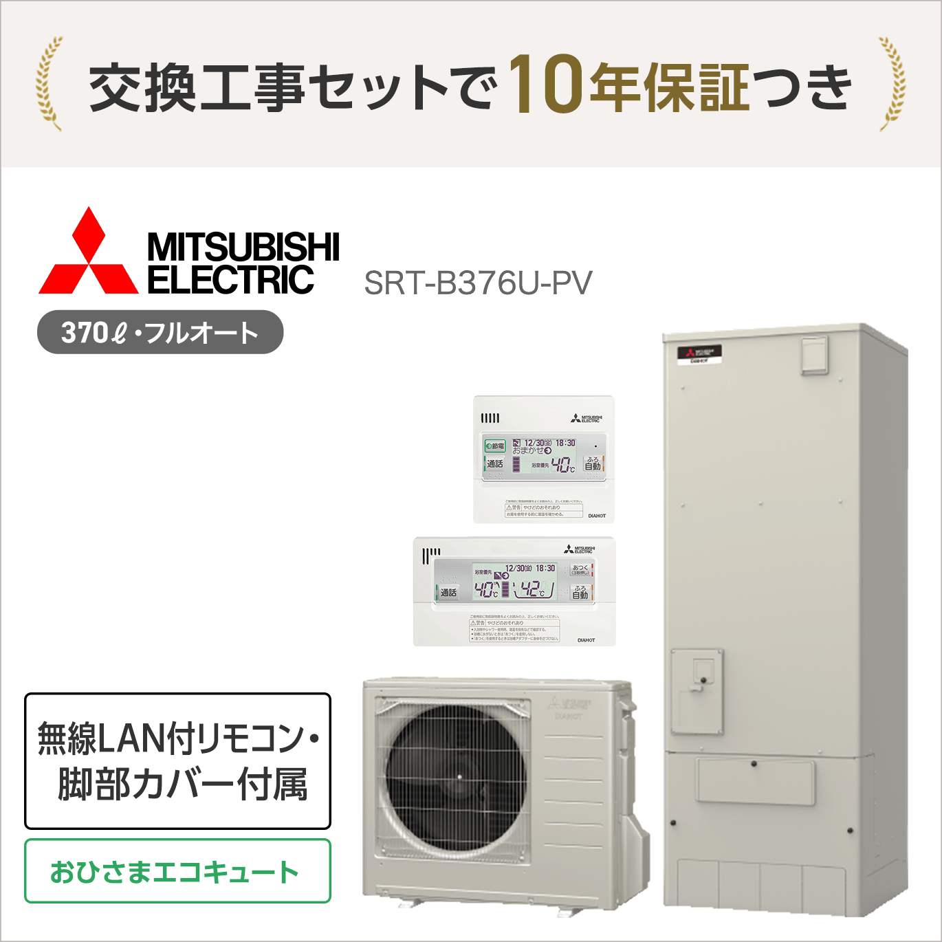 無料10年保証付 三菱 SRT-B376U-PV おひさまエコキュート フルオート370L 3~4人用リモコン・脚部カバー付属 RMCB-D6SE-T-PV GT-M460W<処分費込>【エコキュート+交換工事セットがオトク】