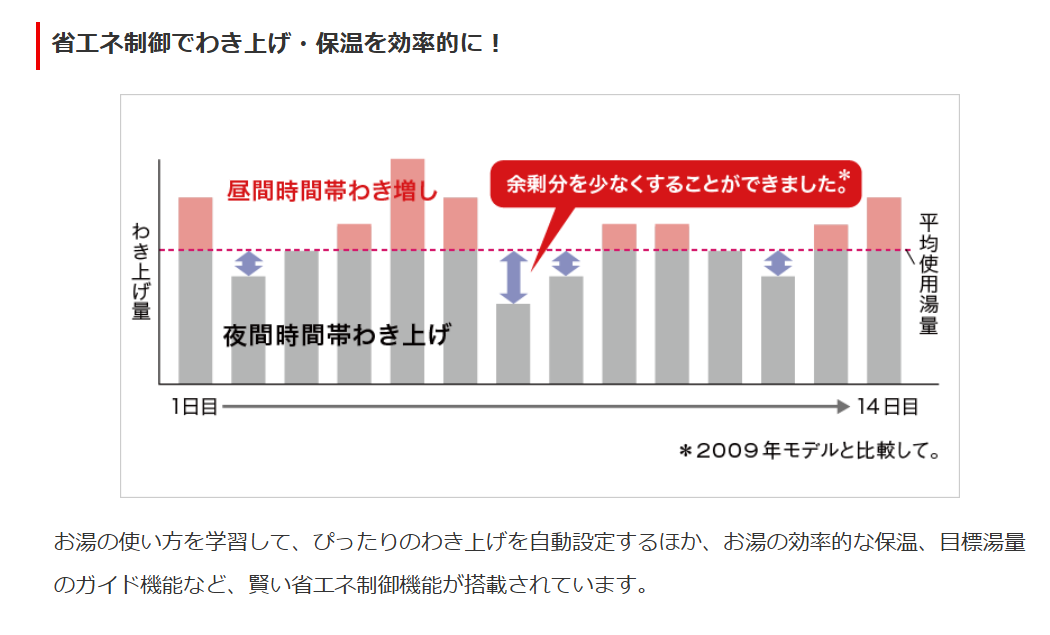 お湯の使い方を学習して、ぴったりのわき上げを自動設定するほか、お湯の効率的な保温、目標湯量のガイド機能など、賢い省エネ制御機能が搭載されています。