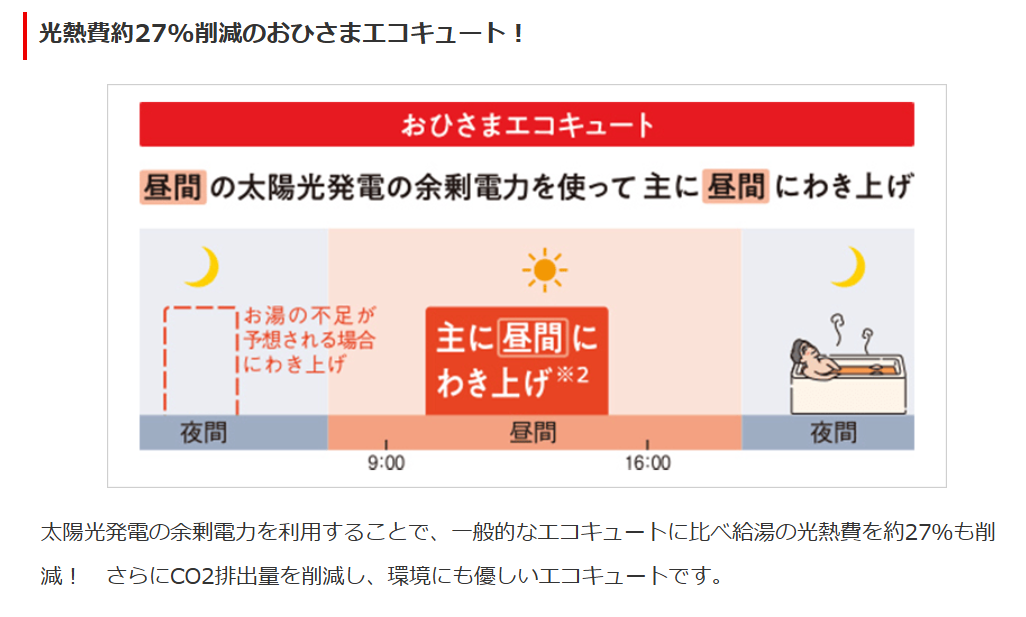 太陽光発電の余剰電力を利用することで、一般的なエコキュートに比べ給湯の光熱費を約27%も削減! さらにCO2排出量を削減し、環境にも優しいエコキュートです。