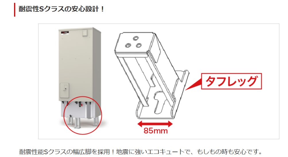 耐震性能Sクラスの幅広脚を採用!地震に強いエコキュートで、もしもの時も安心です。