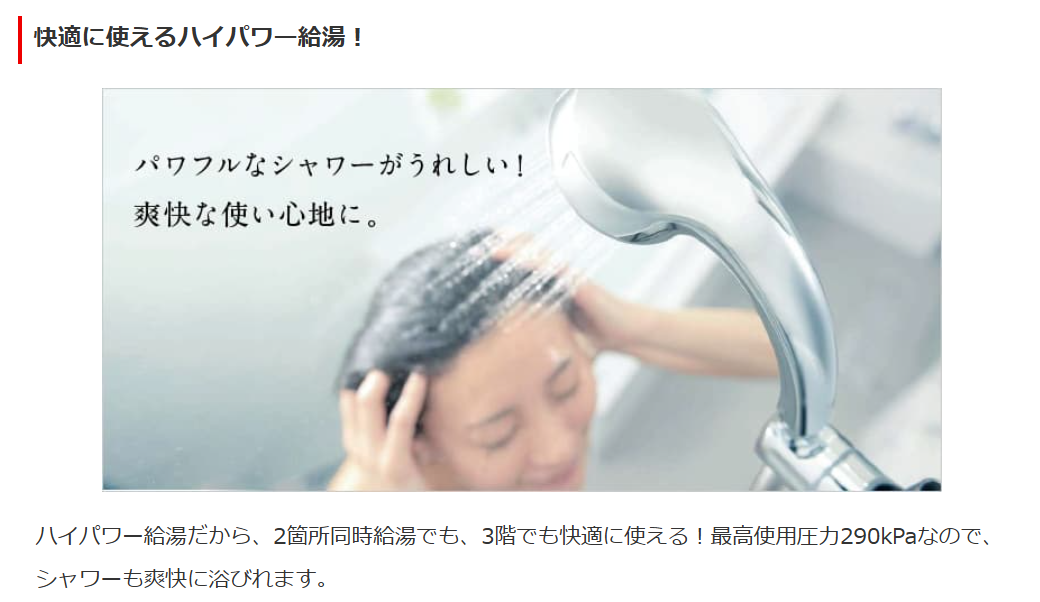 ハイパワー給湯だから、2箇所同時給湯でも、3階でも快適に使える!最高使用圧力290kPaなので、シャワーも爽快に浴びれます。