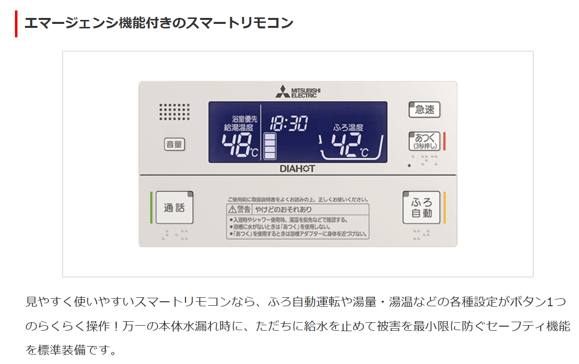 見やすく使いやすいスマートリモコンなら、ふろ自動運転や湯量・湯温などの各種設定がボタン1つのらくらく操作!万一の本体水漏れ時に、ただちに給水を止めて被害を最小限に防ぐセーフティ機能を標準装備です。