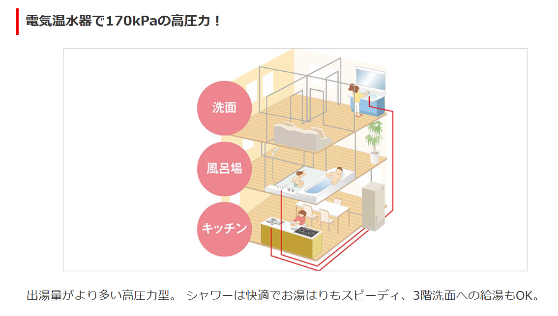 出湯量がより多い高圧力型。 シャワーは快適でお湯はりもスピーディ、3階洗面への給湯もOK。