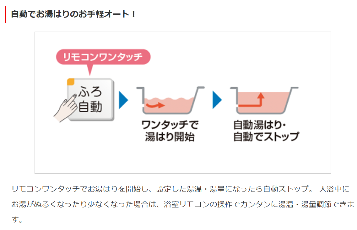 リモコンワンタッチでお湯はりを開始し、設定した湯温・湯量になったら自動ストップ。 入浴中にお湯がぬるくなったり少なくなった場合は、浴室リモコンの操作でカンタンに湯温・湯量調節できます。