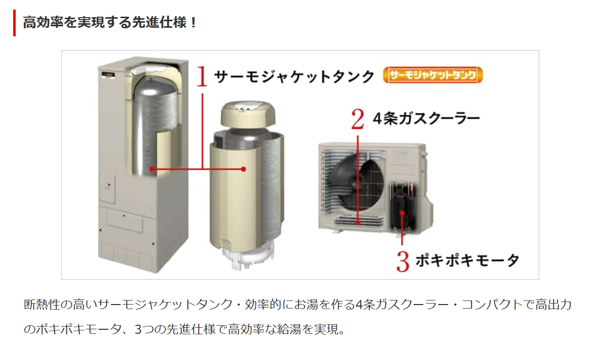 断熱性の高いサーモジャケットタンク・効率的にお湯を作る4条ガスクーラー・コンパクトで高出力のポキポキモータ、3つの先進仕様で高効率な給湯を実現。