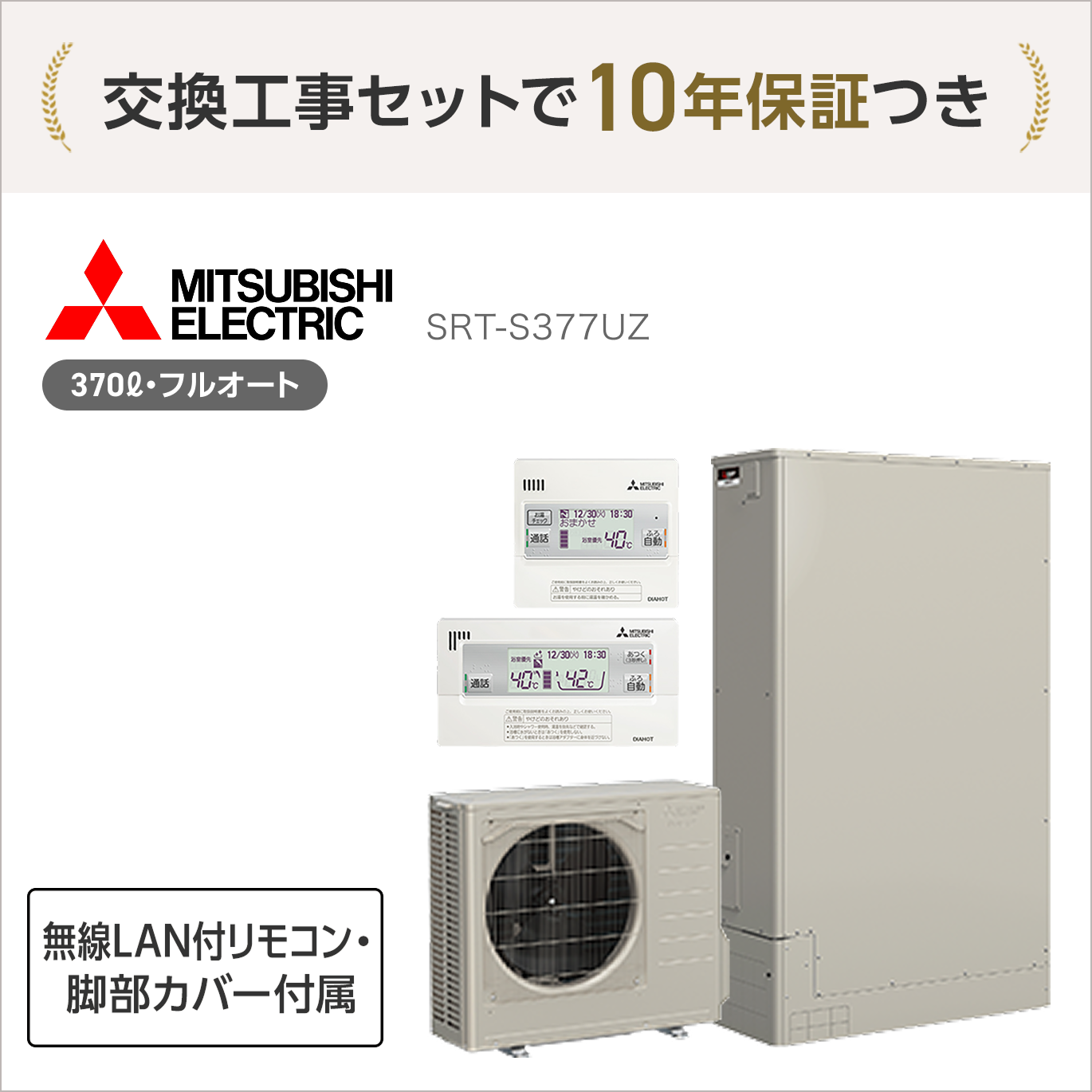 無料10年保証付 SRT-S377UZ エコキュート フルオート 370L 3~4人用 リモコン・脚部カバー付属 RMCB-F7SE GT-L370ZB <処分費込>【エコキュート+交換工事セットがオトク】