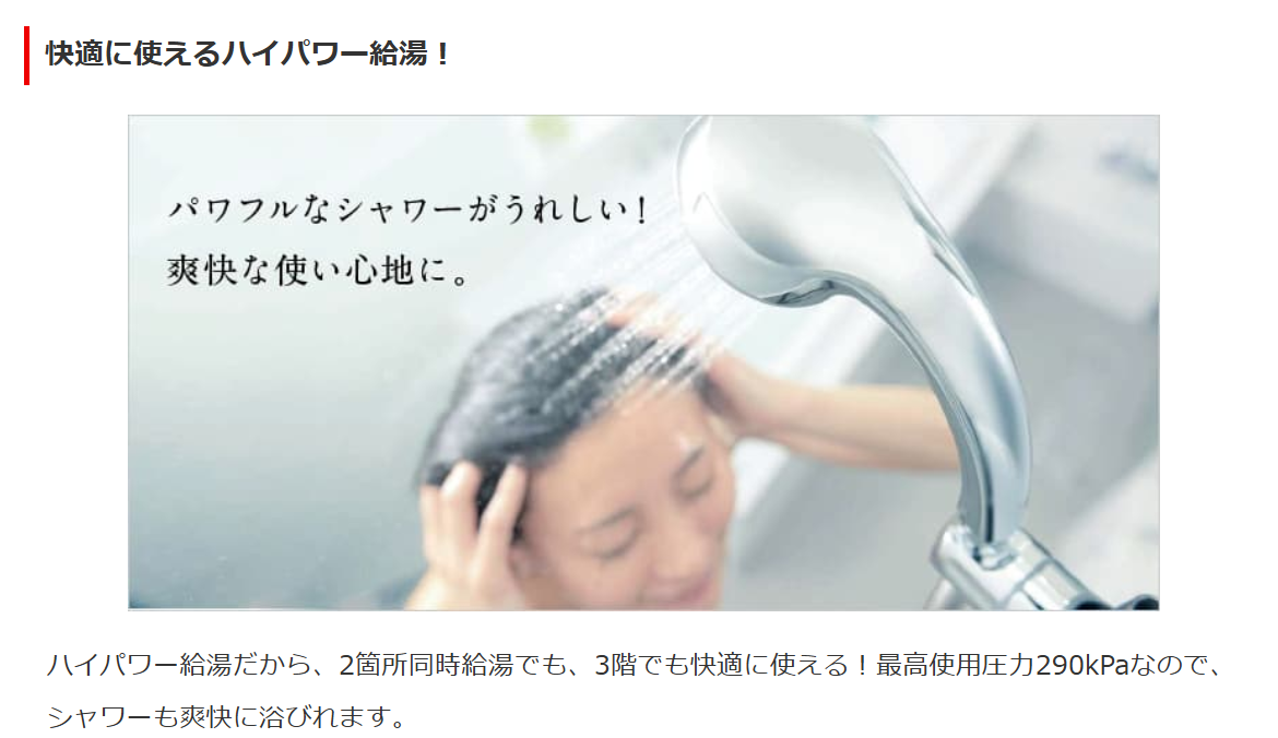 ハイパワー給湯だから、2箇所同時給湯でも、3階でも快適に使える!最高使用圧力290kPaなので、シャワーも爽快に浴びれます。
