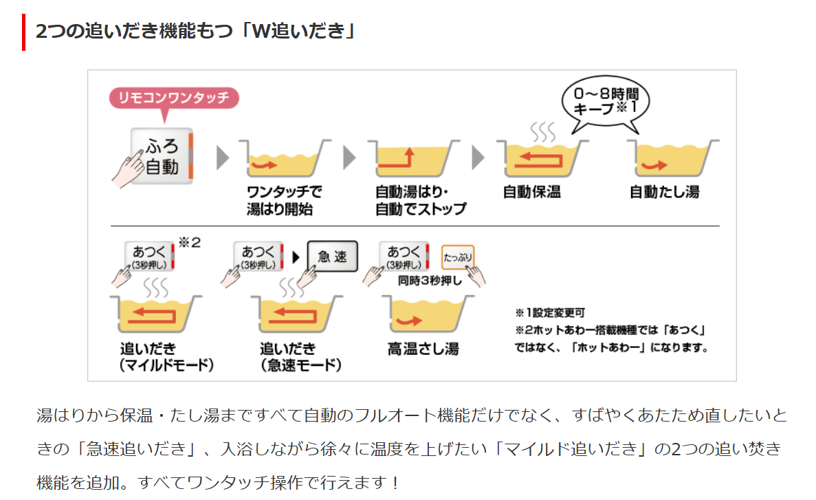 2つの追いだき機能もつ「W追いだき」
