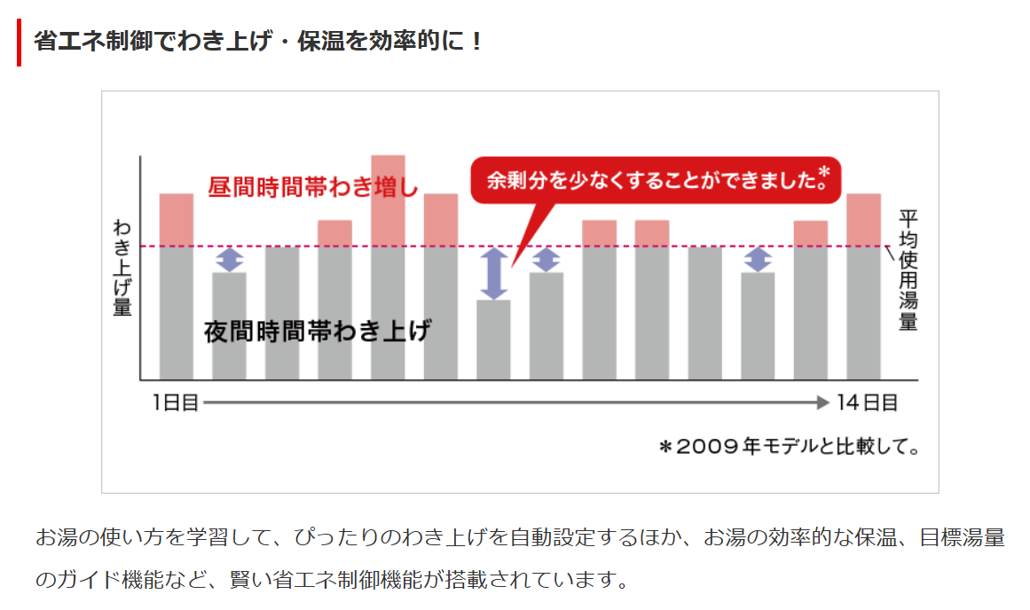 お湯の使い方を学習して、ぴったりのわき上げを自動設定するほか、お湯の効率的な保温、目標湯量のガイド機能など、賢い省エネ制御機能が搭載されています。